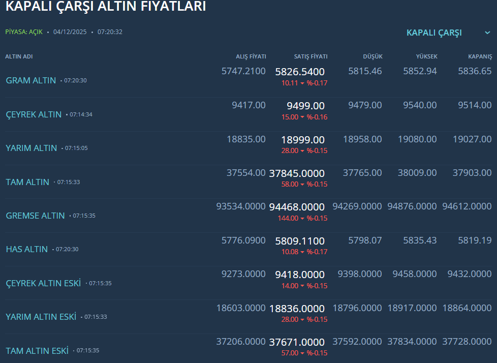 Kapalı Çarşı’da altın fiyatları ise 5 bin 827 liradan satılıyor.