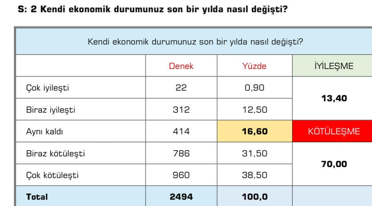 Bu verilerle birlikte, katılımcıların yüzde 70’i son bir yıl içinde ekonomik durumunun kötüleştiğini belirtti. Ekonomik durumunda iyileşme olduğunu söyleyenlerin oranı ise yalnızca yüzde 13,4’te kaldı.