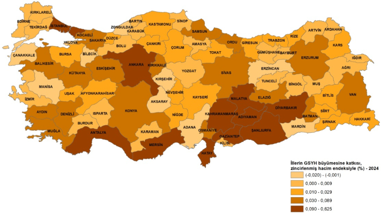 Türkiye’nin GSYH büyümesine en fazla katkıyı sağlayan il İstanbul oldu (yüzde 0,62). Ankara yüzde 0,44 ve Hatay yüzde 0,16 ile İstanbul’u takip etti.