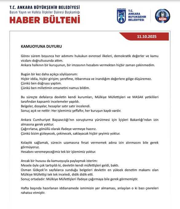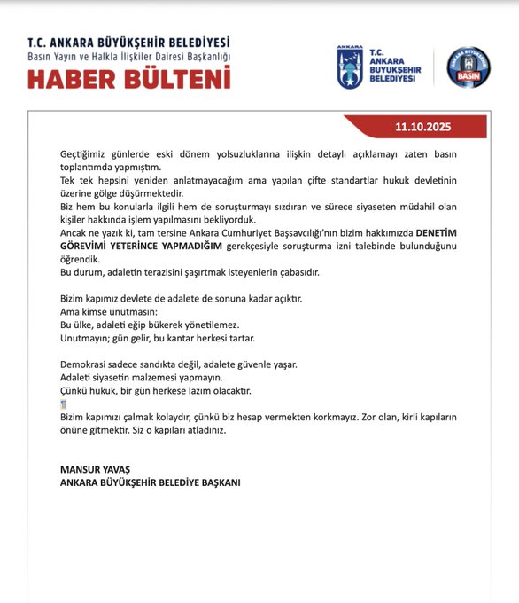 Ankara Büyükşehir Belediye Başkanı Mansur Yavaş, Ankara Cumhuriyet Başsavcılığı’nın İçişleri Bakanlığı’ndan soruşturma izni istemesiyle ilgili olarak yaptığı ilk açılamada, “Ankara Cumhuriyet Başsavcılığı’nın soruşturma yürütmesi için İçişleri Bakanlığı’ndan izin almasına gerek yoktur. Çağırırlarsa, gönüllü olarak ifade vermeye hazırız çünkü bizim gizleyecek, çekinecek, saklayacak hiçbir şeyimiz yoktur Kolaylık sağlamak, sürecin uzamasına fırsat vermemek adına izin alınmasını bile gerek görmüyoruz. Hesabını veremeyeceğimiz tek bir işlemimiz yoktur” dedi.