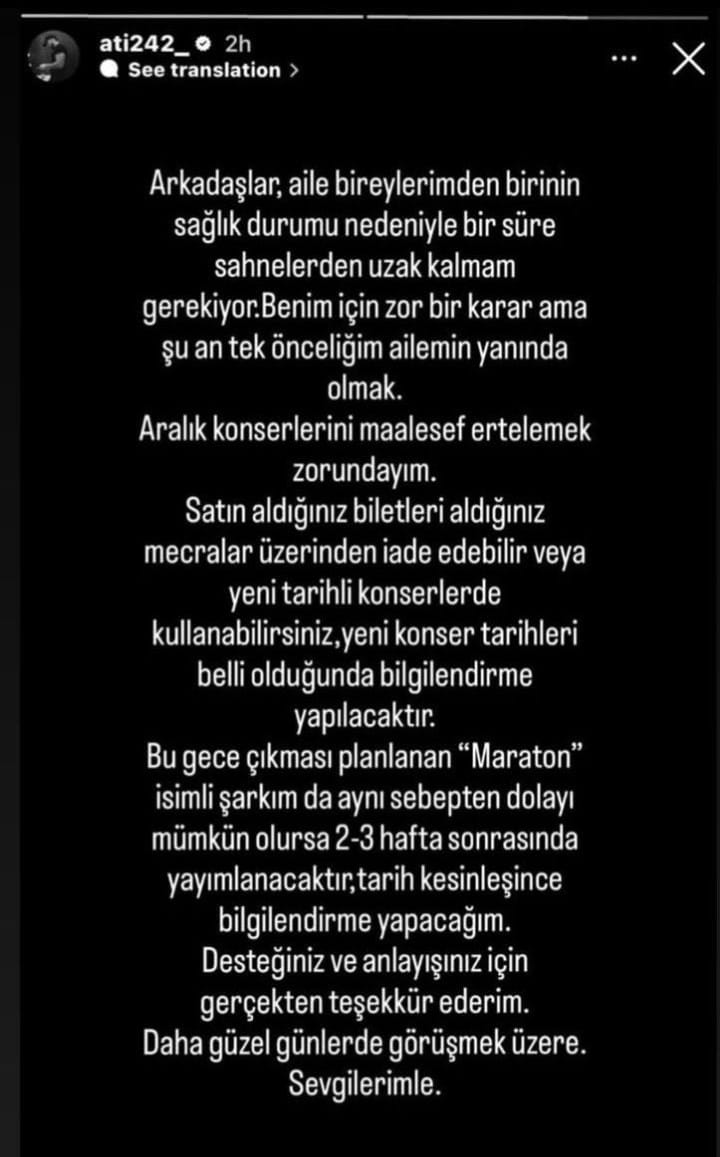 Blok3‘ün ardından rapçi Ati242 de konserlerinin iptal edildiğini açıkladı. Rapçi, ailesinin sağlık sorunlarıyla ilgilenmesi gerektiğini belirterek, konserlerine kısa süreli bir ara vereceğini bildirdi.