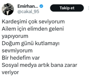 Çakal, sosyal medya hesabından yaptığı açıklamada, sosyal medyanın kendisine iyi gelmediğini belirterek, “Kardeşimi çok seviyorum. Ailem için elimden geleni yapıyorum. Doğum günü kutlamayı sevmiyorum. Bir hedefim var. Sosyal medya artık bana zarar veriyor” ifadelerini kullandı.